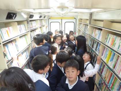 狭い車内はすぐに子ども達で満員。今度は、新たに借りる本が両手一杯です。