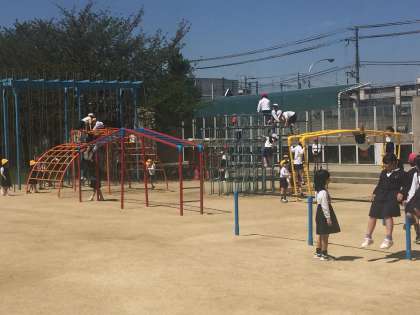 担任の先生と鬼ごっこをしたり遊具であそんだりして、豊里小学校の広い運動場を思いきり楽しんでいます。 (教務)