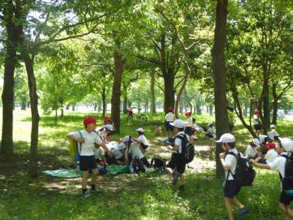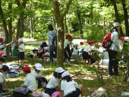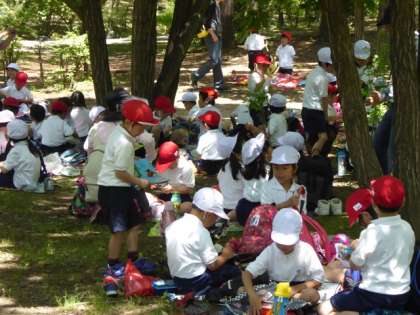 予定していた遊具施設の周りは、他校の遠足の児童で超満員。とても遊べたものではありません。急きょ、予定を変更して、少し早いお弁当です。