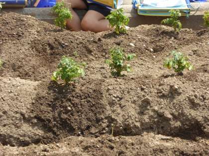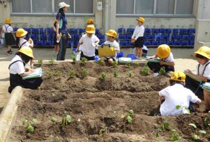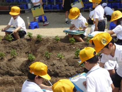 先週、中庭の学習園に、野菜を植えた1年生、今日はその生長観察です。