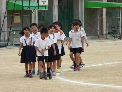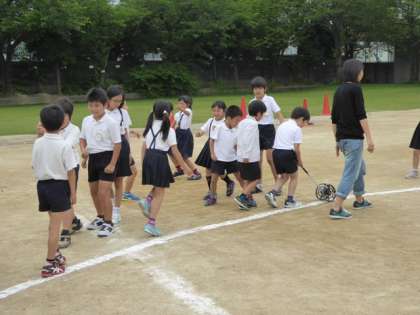 一口に「1キロメートル」といっても子ども達にはなかなかピンと来ない距離、ウォーキングメジャー(マラソンの時の距離測定器の小型版)を使って運動場を歩きます。