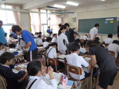 全教員が交互に授業を参観し、成果と課題を整理してメモして行きます。