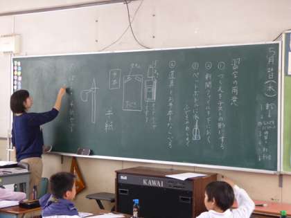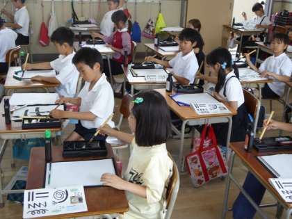 今日は初めてなので、何を書いてもOKです。でも、○や☆、渦巻きに交じって、自分の名前を書き始める児童も… 聞けば習字も習っていなくて今日が初めての筆、将来有望かもしれませんね。がんばれ〜!!