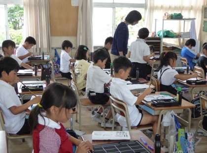 筆を立てて持つということがなかなかできない。すぐに鉛筆を持つように、親指と人差し指の付け根に筆が寝てしまいます。机間を巡視しては丁寧に指導です。