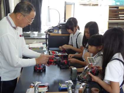 理科室で念入りに作成、調整、セッティング、きれいなフォルムのソーラーカーです。