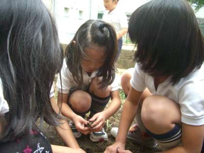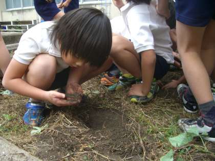 学年の学習園に植えていたサツマイモの収穫をしました。大豊作…とはいきませんでしたが、みんなで育てたサツマイモを掘りあてるたびに歓声があがっていました。収穫したサツマイモは調理して、1年生を招待した「おいもパーティー」で食べます。(2年)