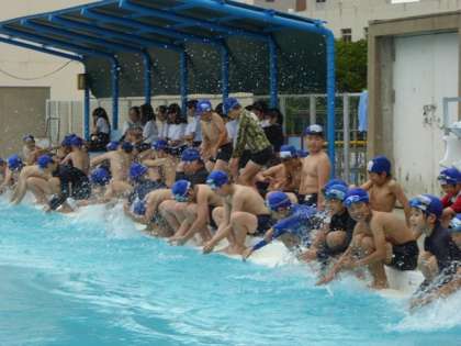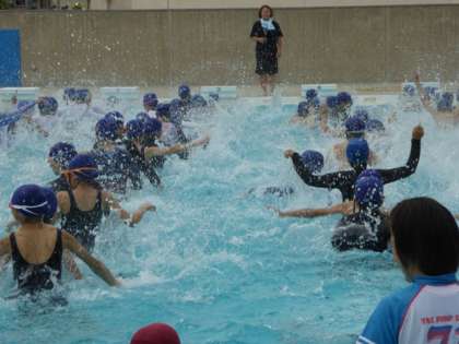 初めての「プール水泳」に心ウキウキの子ども達ですが、出るのは悲鳴ばかりなり(笑)洗体槽で、シャワーで「ワー、ワー!!」「キャー、キャー!!」と悲鳴が飛び交います。