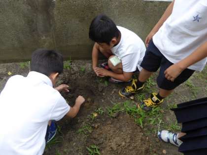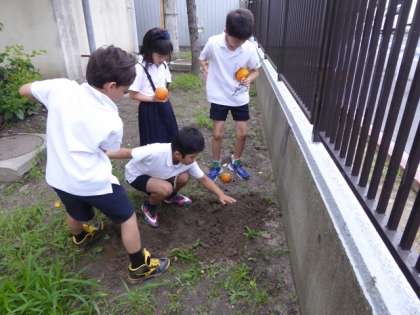 再び校舎裏にスコップで穴を掘って、1匹1匹ていねいに埋葬。裏庭のみかんを一つお供えして、全員で静かに合掌。
