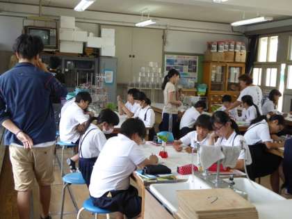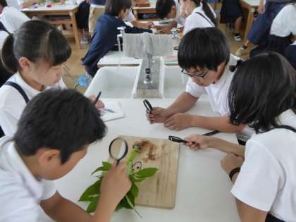 カッターナイフで茎、葉、根を切り色の染まり方を観察します。予想はあっていたかな?でも、まだまだ染まりきらずに、色の付き方がはっきりとわからない班もありました。これは残念。