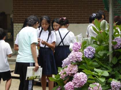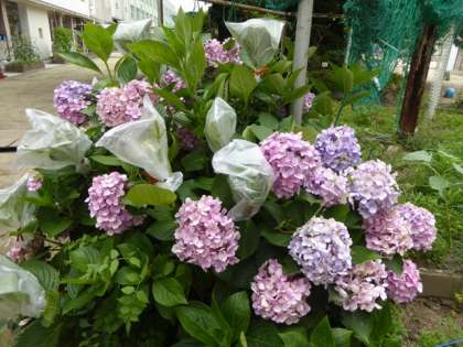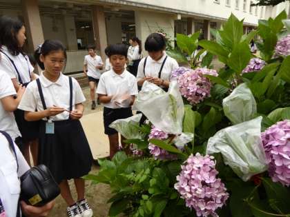 1つは、アジサイの花に袋をかぶせ、空気中の二酸化炭素量と袋の中の二酸化炭素量を比較です。