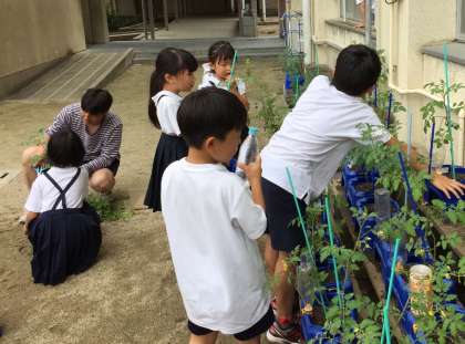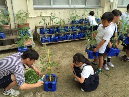2年1組が本格的な梅雨に備えて、生活科で育てているミニトマトの手入れをしました。