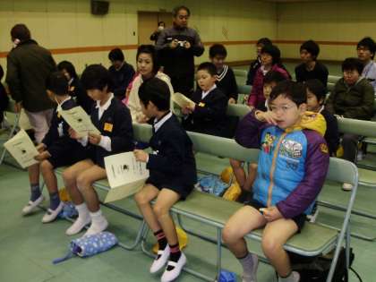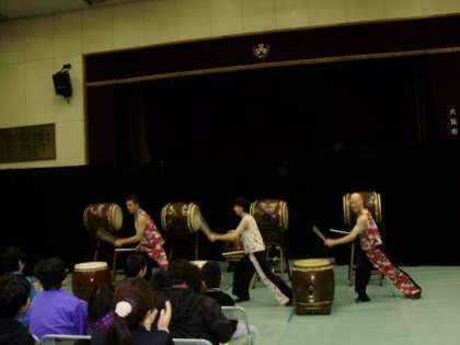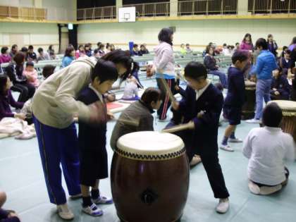 体育館いっぱいに鳴り響く和太鼓の迫力にびっくり、和太鼓の演奏も経験して楽しく交流を図りました。(なかよし)