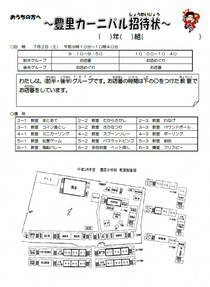 今回はお家の方に見ていただくにあたり、お子さんがどの時間にどのお店で店番をしているのかがわかるように、「豊里カーニバル招待状」(下記のような手紙)を作成いたしました。