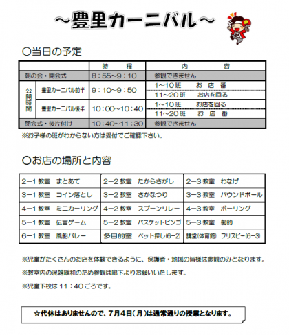 お子さんの班とお店番の時間は、お子さんが持ち帰った招待状に書いてありますのでご参照下さい。