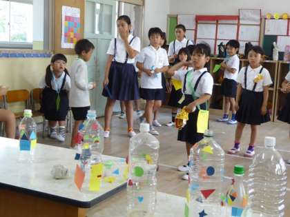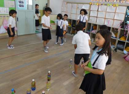 1.【2年1組】「まとあて」:ボールでペットボトルを倒します。