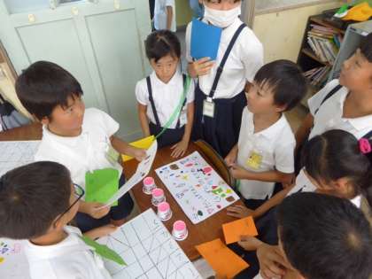 2.【2年2組】「たからさがし」:コップの裏に隠された得点で競います。