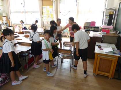 1.【3年1組】「コインおとし」:水の中のカップにコインを。