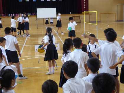 1.【6年1組】「風船バレー」:下級生にもボールを回してね。
