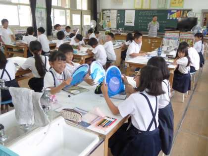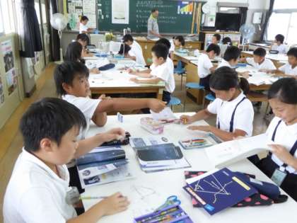 4年1組は、理科室で一生懸命新聞づくり。
