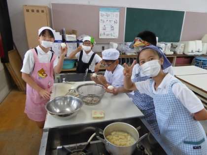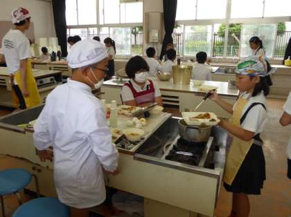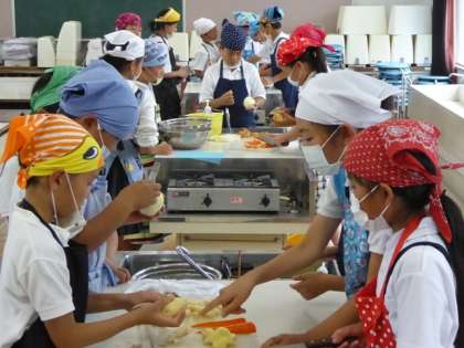 先生の指示をしっかり守り、時間内に各班美味しそうなカレーが完成。給食の白ごはんにそのカレーをかけて美味しくいただきました。
