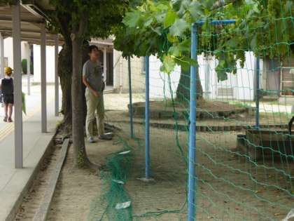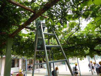 「校長せんせぇ、何してんのん?」と物珍しそうに見ていた児童たちも、道具の運搬を気持ちよく手伝ってくれ、ブドウ棚一面を完全に覆うことができました。