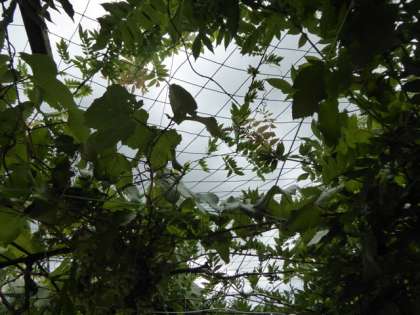 「防球ネット」2枚を結束バンドでつなげた長さが、ブドウ棚の横幅と偶然にもほぼ同じ、通路側を結束バンドで固定して、脚立に乗りながらブドウ棚の上に少しずつずらしていきます。