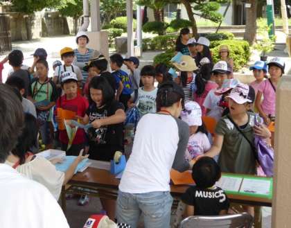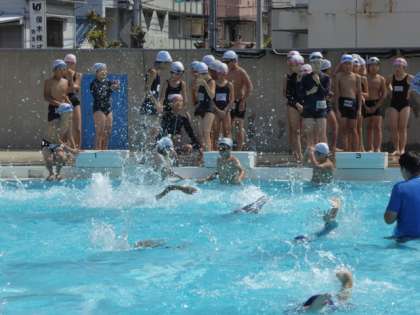 プールサイドとプールの中には、7人の教職員、万全の安全対策です。