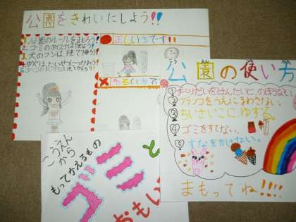 ゴミは家に持って帰ったり、ゴミ箱に捨てたりして、公園をきれいにしましょう。