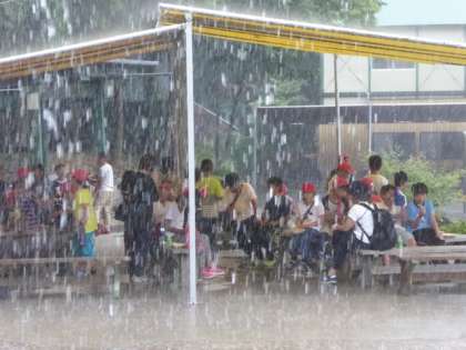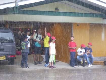 ポツリ、ポツリと雨粒が落ちてきたかと思うと、バケツの水をひっくり返したような豪雨、まるでスコールです。すぐに屋根のあるところに避難、雨男・雨女が絶対にいる(笑)。