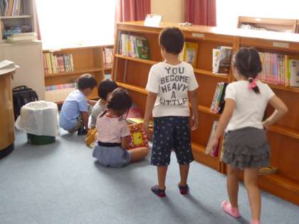 担当の加納先生からおすすめの本を紹介され、本棚の前に座り込んで読み始める子ども達。