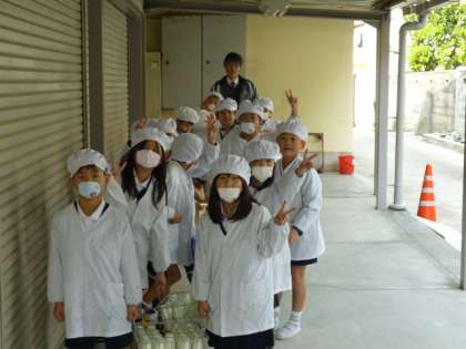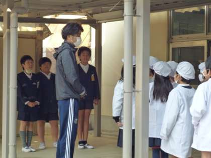 白いエプロンとマスクを身につけ、帽子をかぶった給食係が先生を先頭に給食室へ。