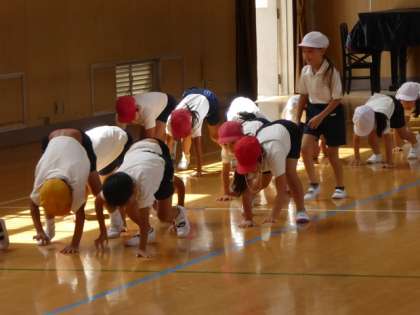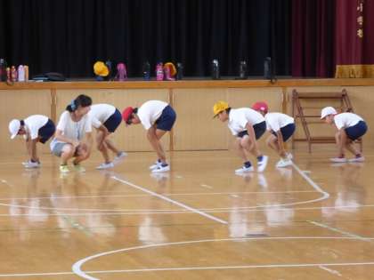 先ずはウオーミングアップで、体育館の中をぐるぐる。でも、単にランニングなんて甘い動きはなし。