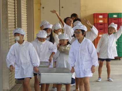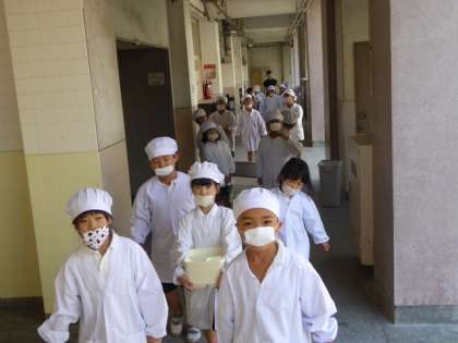 みんなでそろって食べる給食は本当においしいですね。給食調理員の人たちが心をこめて調理してくれています。ありがたく、ありがたく頂戴してくださいね。