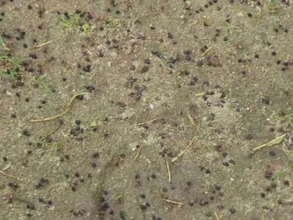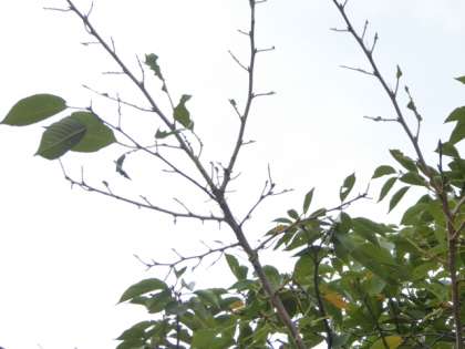 桜の葉がみごとにかじられ、その枝の下には黒い小さな点、点、点…これは毛虫のフン、確かに大量発生の証(あかし)です。