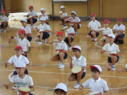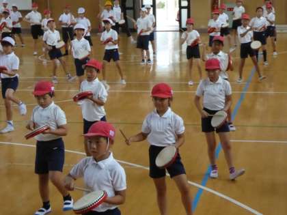 せまくて、暑い多目的室から、今日は広々体育館での練習、4年生の団体演技「エイサー」です。