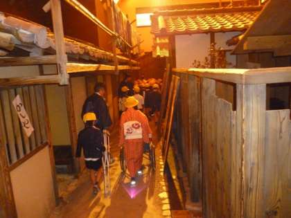 照明で時間や天候の移りも表現され不思議な雰囲気。靴を脱いで座敷にあがることもでき「こんな暗いなかで…」と驚きの声が上がっていました。 (学校長)