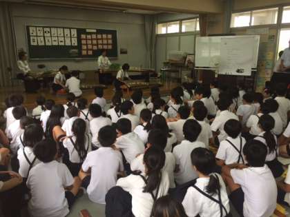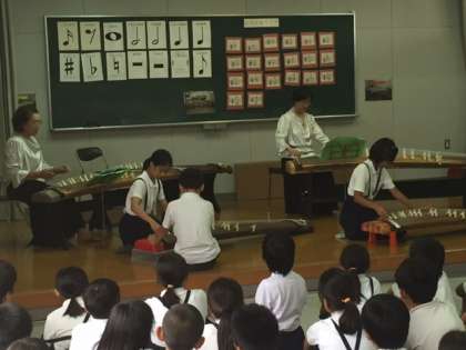 じっさいに5年生が「さくら」の演奏にチャレンジ、その後はお琴の伴奏でリコーダー演奏です。先生の奏でるお琴の曲もしっかり鑑賞させていただき、お礼に「島唄」をリコーダーで演奏しました。