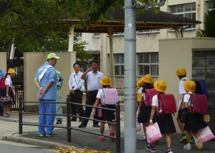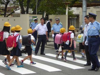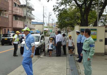 正門前のたくさんの人波とパトカーに登校してくる児童もびっくり。でも、ここでもうすこし元気のいいあいさつがほしかったぁ、残念。