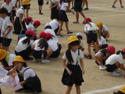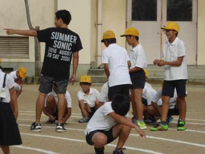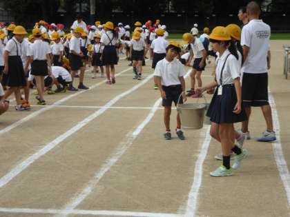 全員で運動場の石ひろいです。広い広い運動場ですが、全校児童が集まるとあっという間、たくさんの小石がバケツに集められていました。