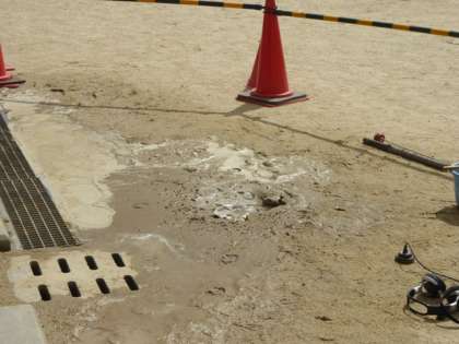 わずか数時間で水道管の破裂箇所を特定、エレベーター等の前、渡り廊下の横に埋められている水道管がサビて水漏れを起こしていることがわかりました。