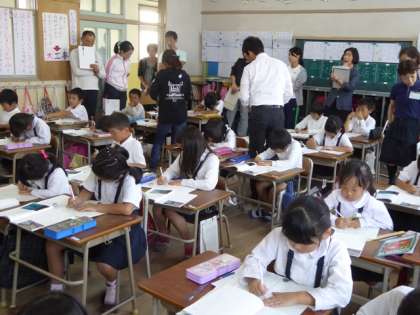 全教員が交互に授業を参観し、成果と課題を整理してメモして行きます。