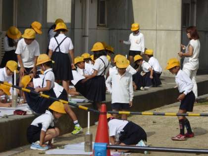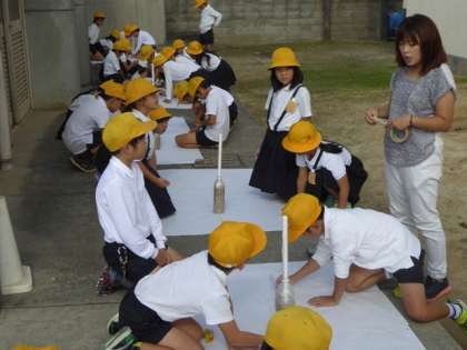 3年2組の理科の時間、「かげのでき方と太陽の光」の観察でした。