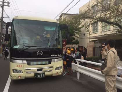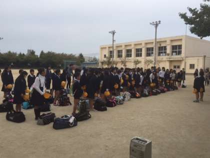 帰校は、明日土曜日の午後6時を予定しています。正門ではなく、通用門にバスが着き体育館で「帰校式」を行います。自動車の通用門付近への駐車はご遠慮ください。またやむを得ず自転車でお越しの際には、通用門付近には停めずに校内(土表の塀ぎわ)にお停め下さい。