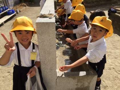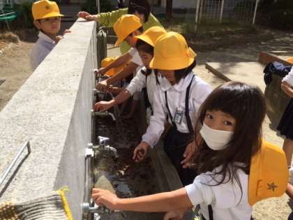 1年3組が中庭の水道でどんぐりをきれいに洗っていました。