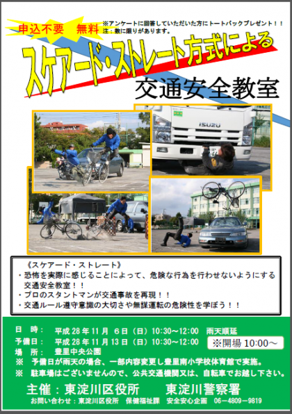 自転車の交通事故が多く発生していることから、交通事故防止に向けた取り組みとして、プロスタントマンに事故を再現してもらうスケアード・ストレート方式による交通安全教室が開催されます。