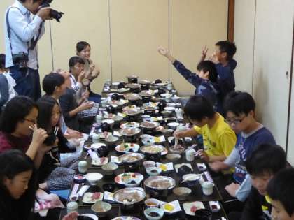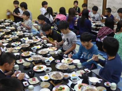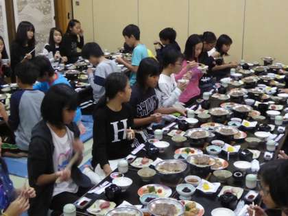 ミールチケットでの昼食があまり重いものでなかったせいか、みんな食べる食べる。中には「先生ぇ〜、ごはんのお代わり11杯目!!」という猛者も。身体がおかしくなるで(笑)。