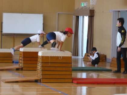 体育館では1組と2組が「とび箱」、運動場では3組が「鉄棒」の練習を繰り返していました。
