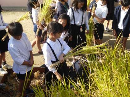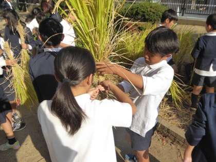 5年2組の児童が、最後に残った「豊里水田」の稲刈りを行いました。ちょっと危なっかしい手つきではありますが、仲間と協力して刈り取った稲をまとめる姿は何か見ていて微笑ましいですね。