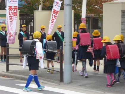 「校長せんせぇ、ハタもってきていい??」と、タスキだけでなくハタもたなびくあいさつ運動。みんなの登校をしっかり支えてくれています。