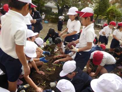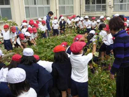 5月に中庭の学習園にうえたサツマイモ、青々としたサツマイモの葉がびっしりと覆い、その下にはきっと大きなお芋が育っているはずです。